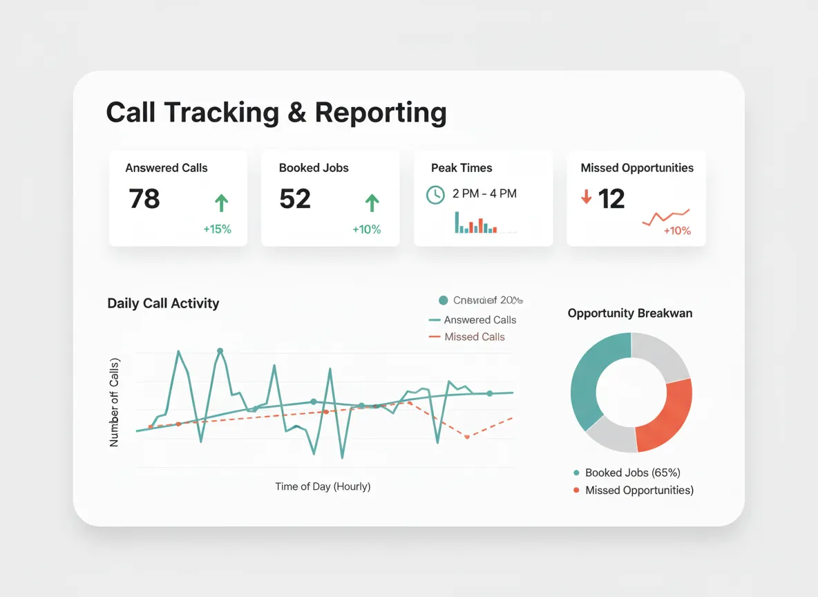 Track answered calls, booked jobs, peak times, and missed opportunities.